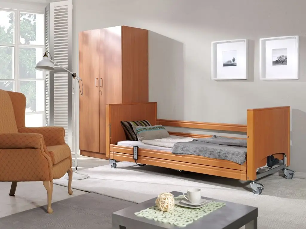 Bed type Classic FS Low 90×200 incl. zijhekken, met metalen ligvlak 4 delig. Elektrisch hoog/laagbed met volledig houten ombouw. Standaard voorzien van bedheffer en houten neerlaatbare zijhekken.